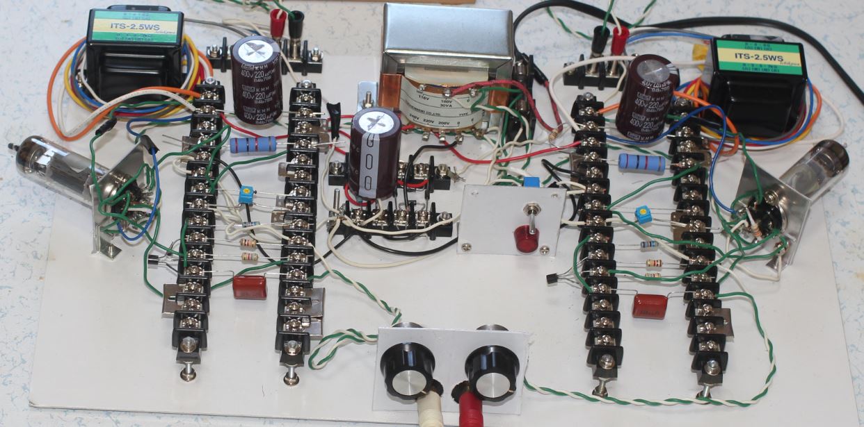 ♪ 試作ボードによる制作 今回は、改造を前提とした制作になることから、ブレッドボードスタイルで試作してから、本番機を制作することにします。 下の写真がブレッドボードスタイルの試作用ボードです。 縦25cm*横40cm*厚さ2mmのアルミ板の上に、トランス類を配置し、抵抗やコンデンサー等の部品を2列に並べたネジ式端子盤台で固定、また、SW、ボリューム、真空管などの部品は、幅5cm*厚さ1mmのアルミ板を適当な長さで切り出して、これに固定して取り付けています。(この程度のアルミ板なら、カッターで何度かけがいて切れ目を入れてから、曲げ戻しを数回繰り返せばパキッと折れます。)真空管は、アルミ板にあけた穴の位置を間違えて、横向きになっちゃいました。マニュアルに「Opereating Posision・・・・any」とあったので、まぁ実験機ならいいかなと、、、 ベースのアルミ板の表面が白いのは、白色の表面保護シートを剥がさないで使っているためです。 配置は、配置の差が左右のチャネルでの特性の差に表れないよう、電源部を真ん中に、左右にそれぞれの増幅部、としました。 1日ほどで完成、なかなか具合がいいです。